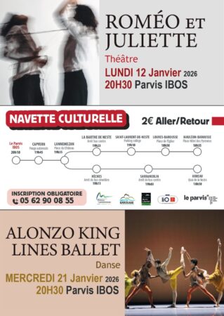 Commencez l’année en beauté et offrez-vous une sortie culturelle ! La navette culturelle du Pays des Nestes vous permet de vous rendre facilement au Parvis à Ibos, sans contrainte de transport, pour profiter pleinement de spectacles de théâtre et danse, à des tarifs préférentiels et pour seulement 2 € l’aller-retour. Même lorsque les spectacles affichent complet, des places sont réservées aux usagers de la navette.