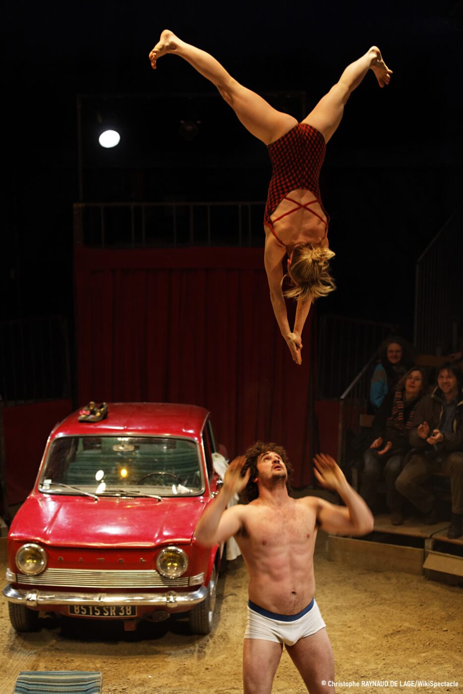 Au rythme de l’autoradio, le couple nous plonge dans une mise à nu de la vie de cirque, de la vie de couple au cirque, loin des paillettes et des applaudissements. Il y a les déplacements, la route, la voiture, les chiens. Il y a l’amour, le travail, la prouesse technique. Cette histoire de couple n’est pas ordinaire, certes non ! Comment vivre sa vie sur la route, de spectacle en spectacle, de montage en démontage ? Comment passer de la lumière de la piste à l’ombre et aux rudesses de la vie itinérante ? Numéros de main à main, figures acrobatiques époustouflantes, jeux icariens, échelle aérienne, domptage, trapèze… leurs prouesses techniques servent un récit émouvant, haletant et généreux. Le couple d’artistes et leur fidèle Simca 1000 nous accompagnent loin dans l’intime de la relation, de l’âme humaine et de l’humour.